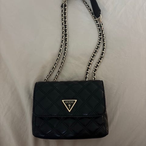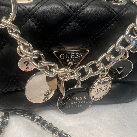Guess olkalaukku naisille. Materiaalina tekonahka, väri musta. Laukussa on säädettävä olkahihna, jossa yhdistyy tekonahka ja metalliketju. Pääosastossa on vetoketjusuljenta ja sisällä vuorikangas sekä pieni sisätasku. Kompakti koko sopii esimerkiksi puhelimen, pienten arvoesineiden ja korttikotelon kuljettamiseen.