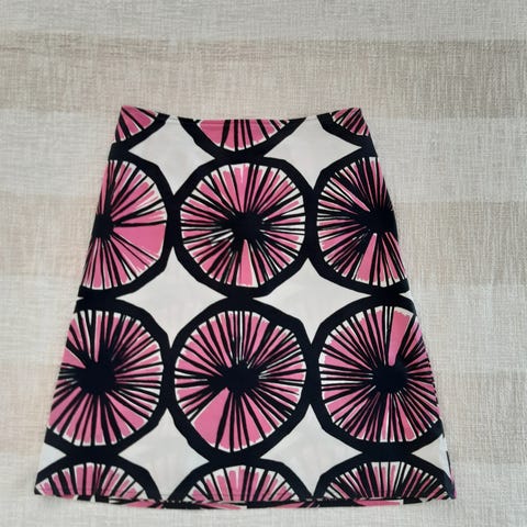 Myydään Marimekon hame vuodelta 1976. Hameen materiaali on samettimaista, jämäkkää puuvillakangasta, jossa on harmaa pieni lehtikuvio mustalla pohjalla.
