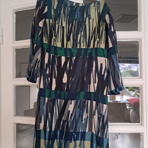 Juhlaan tai arkeen sopiva kauniisti laskeutuva mekko. Merkki Ril's. Takana syvä v aukko ja paksu nauha solmittavaksi. Koko 36.
