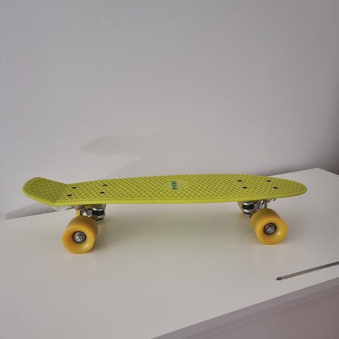 Hot Wheels skeittilauta, jossa värikäs graafinen kuosi kannen yläpuolella ja vihreät renkaat. Laudassa on perinteinen muoto ja se soveltuu perus skeittaukseen. Pohjassa näkyy kulumaa, joka ei näy käytössä päältäpäin. Sopii esimerkiksi pihalla ja skeittiparkeissa ajamiseen. Skeittilaudassa on valmiiksi asennetut trukit ja renkaat.