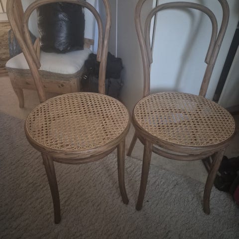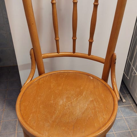 Ton -tyylinen tuoli, kahvilatuoli / wieniläistuoli/ alkuperästä ei tietoa, mutta siisti ja hyväkuntoinen tukeva tuoli. Istuinkorkeus 49 cm , istuinosa helppohoitoista pehmustettua keinonahkaa. Kaarevat kauniit puuosat, selkänojan taakse tarttunut seinästä vaaleaa maalia, saa kevyesti hiomalla pois. Näkyy viimeisessä kuvassa. Tukeva tuoli, vaikka työpöydän eteen. Kulkeutuu omien menojen mukaan Muurame, Luhanka.