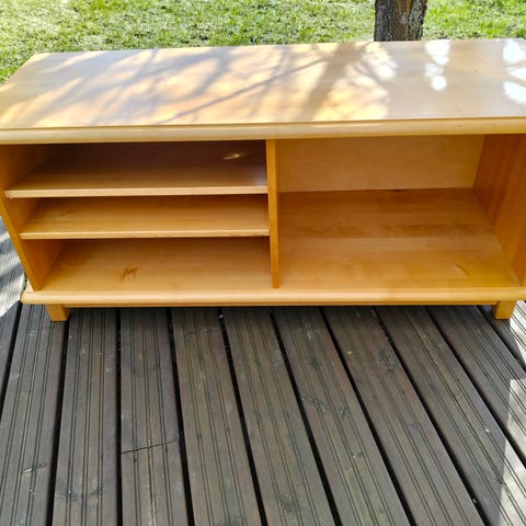 Hyväkuntoinen massiivipuinen tv-taso. Jotain käytön jälkeä löytyy, mutta ei haittaa käyttöä.