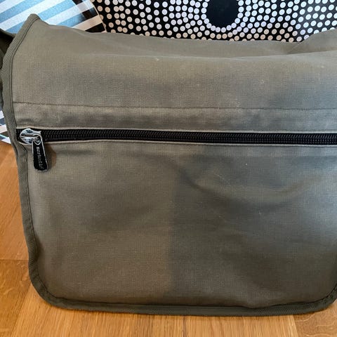 Marimekko isompi olkalaukku unisex-käyttöön. Materiaalina musta kangas. Laukussa on läppäkansi, säädettävä olkahihna ja edessä vetoketjutasku. Sisäosa on yhtenäinen, ja laukun koko sopii arjen peruskäyttöön, kuten kirjojen, pienten laitteiden ja muiden päivittäisten tavaroiden kuljettamiseen.