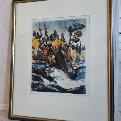Kehystetty mustavalkoinen taidegrafiikan vedos. Kuvassa istuva hahmo laiturilla tai rantamaisemassa. Teos on paspiksella varustettu ja puukehyksissä, sopii seinälle ripustettavaksi sisustuselementiksi. Alareunassa käsinkirjoitettu teksti ja vuosiluku, jotka viittaavat taiteilijan signeeraukseen ja ajoitukseen, mutta tarkka nimi ei ole luettavissa kuvista.