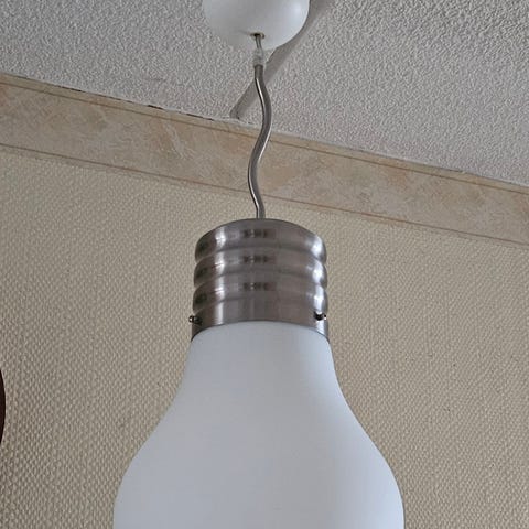 Tuulikaappiin, eteiseen tai muuhun pieneen tilaan sopiva valaisin. Kuvun läpimitta on 12 cm ja korkeus 14 cm. Kupu on laadukasta, himmeän valkoista lasia ja sen alaosa on kiiltäväpintanen yläosan ollessa himmeäpintainen. Liittäminen tulpalla kattopistorasiaan.