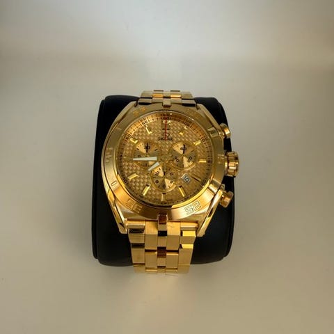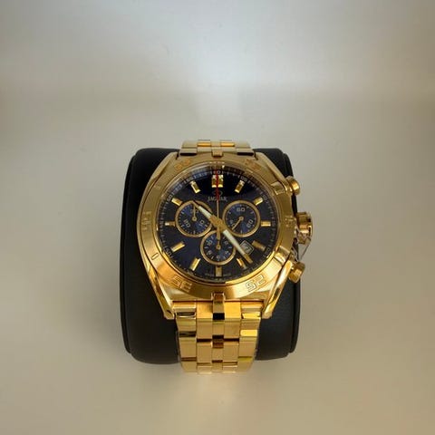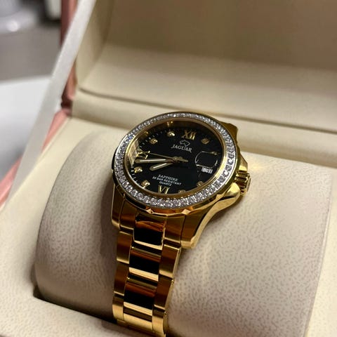 Jaguar J1023/1 – Sveitsissä valmistettu – Kronografis – Keraami & Ruusukullan sävy – Urheilu-luksus – UusiJaguar J1023/1 on huomiota herättävä sveitsiläinen kronografibrändi, joka yhdistää urheilullisen suorituskyvyn hienostuneeseen luksukseen. Sen rohkea muotoilu yhdistää voimakkaan yhdistelmän mustia keraamisia elementtejä ja ruusukullan sävyisiä yksityiskohtia, mikä antaa kellolle erottuvan ja premium-olemuksen ranteessa.Kello on varustettu yksityiskohtaisella kronografinäytöllä, mukaan lukien useita pieninäyttöjä tarkan ajanmittauksen varmistamiseksi, sekä päivämäärävalinnan klo 6 lisätoiminnona. Käytetyt indeksit ja luminesoivat osoittimet varmistavat erinomaisen luettavuuden, jopa hämäräolosuhteissa.Erityinen piirre on yksisuuntaisesti pyörivä keraaminen bezel, joka parantaa sekä kestävyyttä että sen urheilullista sukellukseen viittaavaa estetiikkaa. Tukevat rungon ja rannekkeen yhdistelmät koostuvat ruostumattomasta teräksestä ja keraamisista linkeistä, tarjoten sekä voimaa että naarmuuntumisen kestävyyttä.Toiminnaltaan luotettava sveitsiläinen kvartsikronografia liike varmistaa tämän mallin tarkkuuden, kestävyyden ja helppokäyttöisyyden.Tekniset tiedot • Brändi: Jaguar • Malli: Sport Chronograph • Viite: J1023/1 • Tila: Uusi / käyttämätön • Liike: Sveitsiläinen kvartsikronograf • Toiminnot: Tunnit, minuutit, sekunnit, kronograf, päivämäärä • Rungon materiaali: Ruostumattomasta teräksestä sekä ruusukullan sävyillä • Ranneke: Ruostumaton teräs & keraaminen ranneke • ILLUMINOIT: Musta kellonäyttö kronografianäyttöineen • Bezel: Musta keraaminen pyörivä bezel • Kivi: Safiirilasi • Vesitiiviys: 10 ATM (100 metriä) • Alkuperä: Sveitsissä valmistettuToimitusKello pakataan huolellisesti ja lähetetään turvallisesti seurantan kanssa.