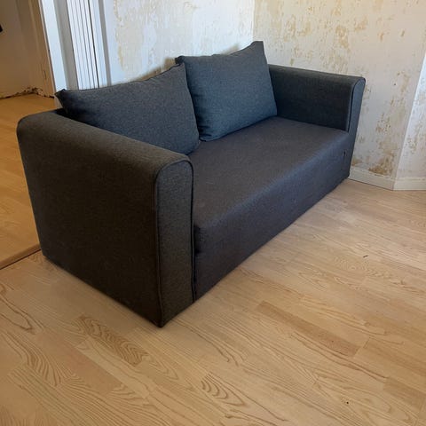 Vuodesohva vailla uutta omistajaa. Sopii hyvin esimerkiksi varavuoteeksi. Sohvan selkänoja repsottaa joten se pitäisi olla seinää vasten(sen saa kyllä tietääkseni pitkällä ruuvilla korjattua). Istuintyynyt ovat litistyneet.
