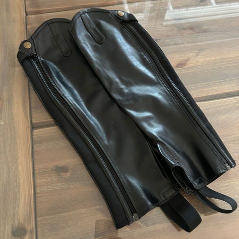 Nahkaiset ratsastus-chapsit. CRW. Väri musta. Sopivat ratsastuskäyttöön ratsastussaappaiden sijaan tai niiden kanssa käytettäviksi, tarjoavat lisäsuojaa ja tukea pohkeille. Hyväkuntoiset.