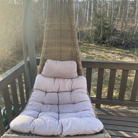 Korituoli on uudelleen maalattu ja pidetty viime vuodet sisällä. Nyt kuitenkin painava kaveri istui tuolille ja sen tukipiste vääntyi sivulle. Vaatisi toisen pultin tueksi. Meillä on parvekkeella kaksi korituolia, joten en enää vaivautunut. Pehmuste on ehjä, mutta auringon haalistama. Muutama tukiputki hajonnut, mutta korjattu valkoisella sähköteipillä.