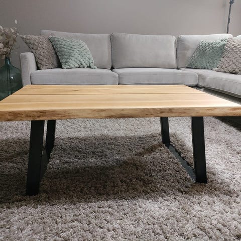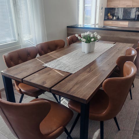 Mäntylankuista tehty ruokapöytä, käsitelty Osmocolorin puuvahalla. Pinta ei ole tasainen, kaipaa höyläystä, hiomista, pintakäsittelyn tai joutaa vaikka polttopuuksi. Jalat Pinnijalkapoikien Heavy Duty 12mm paksut, 3 sauvaiset teräspinnijalat.