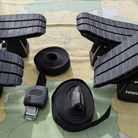 henkilöauton kattotelineisiin. Sarja sisältää neljä mustaa jalkaa, joissa on kumipintaiset, uritetut tartuntapinnat. Oli käytössä alle viisi kertaa. Myynnissä myös siihen sopiva Thule kattoteline.