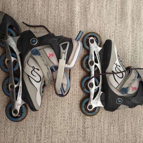 K2-merkkiset rullaluistimet. Murtuneet yhdestä kohtaa, niin ettei enää rullaluisteluun sovi, mutta varaosiksi kyllä.