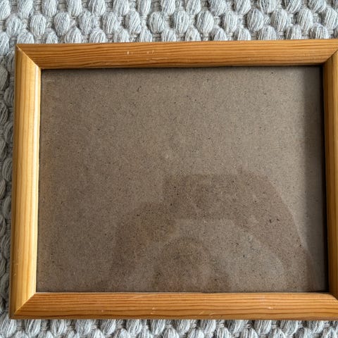 Kuvakehys pöydälle tai seinälle. Kehyksessä on vihertävä, hieman kulunut puinen reunus ja sisäpuolella vaalea koristereunus. Sopii esimerkiksi valokuville tai pienille taidekuville. Ulkomitat ja tarkka kuvakoko eivät käy ilmi, mutta kehys on suunnilleen pienen pöytäkehyksen kokoinen.
