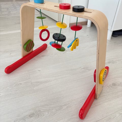 IKEA leikkikaari vauvalle. Puinen runko ja värikkäät muoviset leikkiosat.