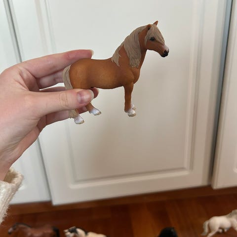 Schleich hevosfiguuri. Muovinen vaaleanvärinen hevonen, jossa tummempi harja, häntä ja jalat. Soveltuu leikkeihin ja kokoelmiin hevosaiheisista leluista pitäville lapsille. Koko noin pienen käden mittainen (katso mittasuhteet kuvista). Huomaa päässä kaksi pientä mustaa tahraa.