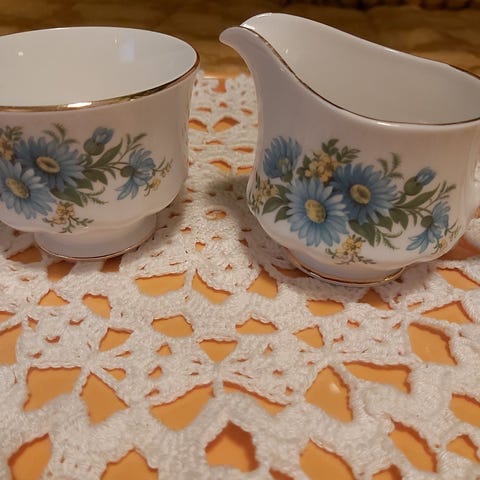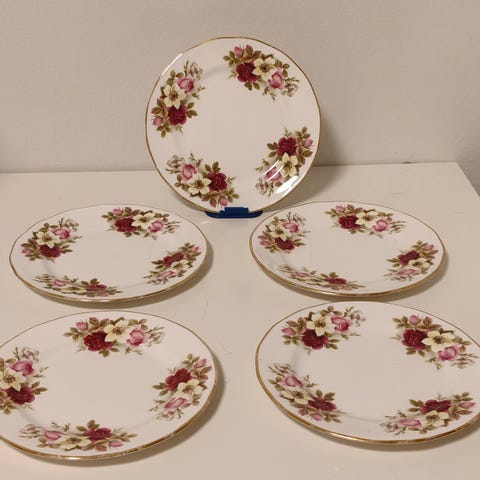 Kaunis vintage Queen Anne kahvisetti Englannista. Settiin kuuluu 2 kahvikuppia, 2 aluslautasta, sokerikko ja kermakko. Klassinen ruusukuvio. Astiat siistit ja hyväkuntoiset. Kermakon pohjan reunassa pieni lohkeama, ei näy käytössä (katso kuva).