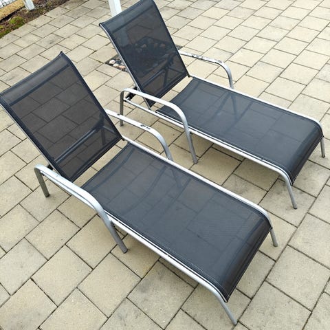 Kesää odotellessa. Auringon haalistamat auringonotto tuolit. Menee melkein makuulleen. Yksi 20e molemmat yhteensä 30e.