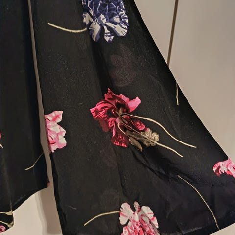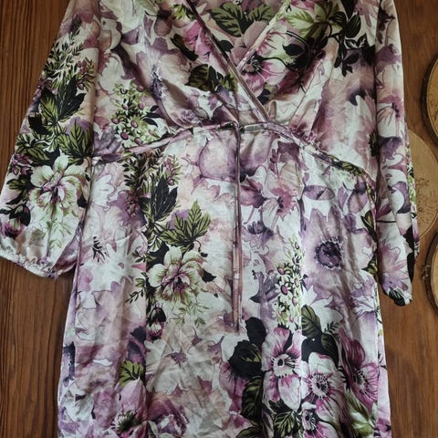 Sivuilta helmasta pidempi käyttämätön kukkapaitis, laput tallella.