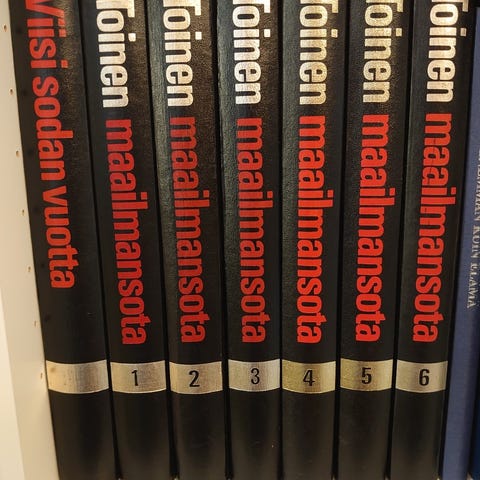 Hyväkuntoinen, 7-osainen kirjasarja "Toinen maailmansota". Kirjasarja kertoo kattavasti kaikki toiseen maailmansotaan liittyvät tiedot ja vaiheet.