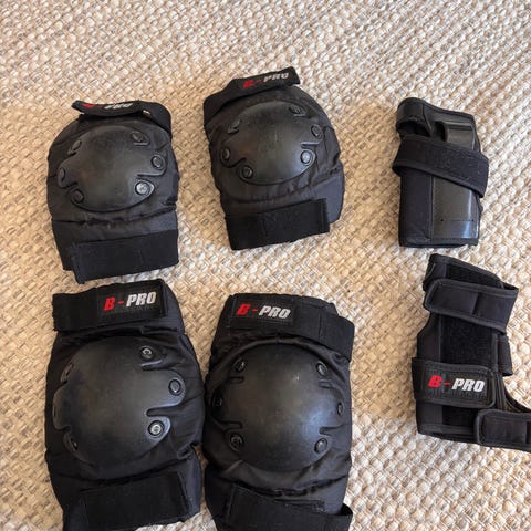 LA Sports suojavarustesetti, johon kuuluu polvisuojat, kyynärsuojat ja rannesuojat. Väri musta. Suojissa on kovat muoviset kuoret ja pehmustetut tekstiiliosat, kiinnitys tarranauhoilla.