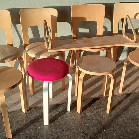 Artek Alvar Aalto tuoli koivuvanerirunko ja vaalea nauhapunosistuin