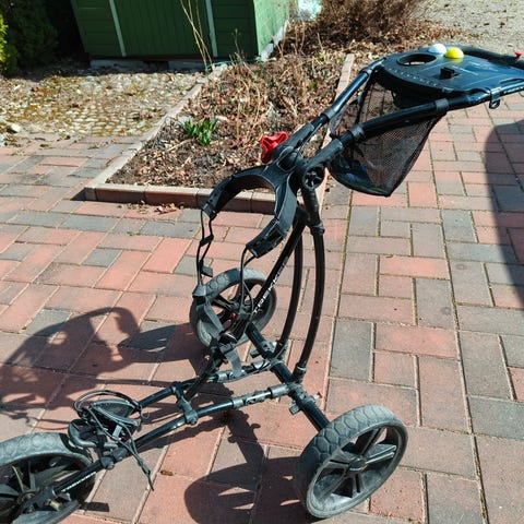 Clicgear golfkärry vihreä musta. Kolmipyöräinen, käsin työnnettävä golfkärry, jossa runko ja vanteet vihreät sekä mustat yksityiskohdat. Kärry on kokoontaitettava säilytystä ja kuljetusta varten. Varustettu kahvalla, jarrulla ja hihnoilla golfbägin kiinnitystä varten. Soveltuu golfbägin kuljettamiseen golfkentällä.