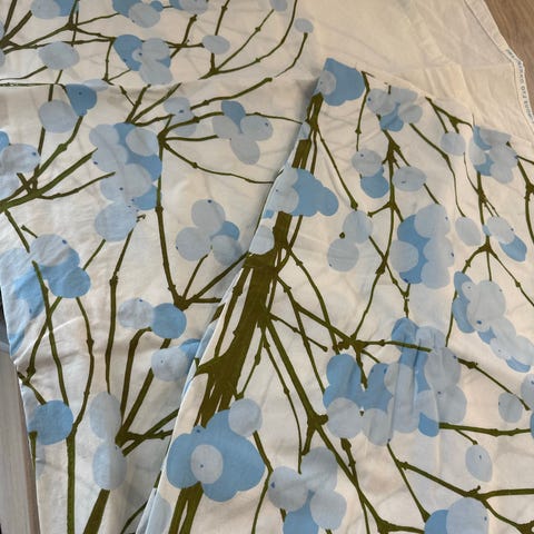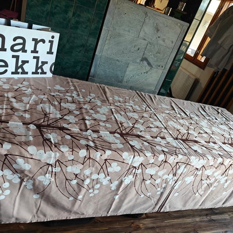 Marimekko verhokangas oksakuviolla. Vaalea pohjaväri, jossa ruskeasävyinen oksa- ja pistekuviointi, myös vaaleansinisiä palloja. Sopii verhoihin, sisustustekstiiliksi tai ompeluprojekteihin, kuten pöytäliinoihin tai tyynyliinoiksi.