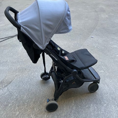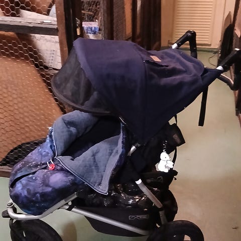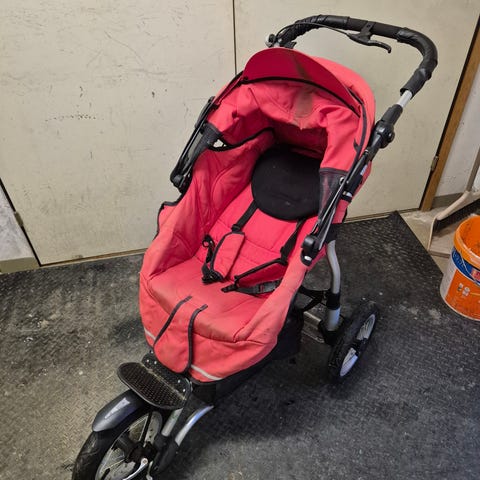 Mountain buggy -merkkiset juoksurattaat, kunto käytetty ja kankaat haalistuneet, mutta muuten toimivat. Etupyörän saa lukittua kääntymään tai paikalleen. Jarru toimii, selkänojan saa laskettua alas ja kuomuissa hyvät säädöt. Mukana juomapulloteline ja toiset, pienemmät takarenkaat.
