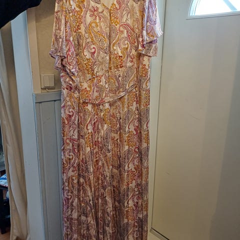 Ellos naisten kesämekko, koko 52. Väri vaaleanpunainen monivärisellä kuviolla. Materiaali kevyttä polyesteriä. Mekossa lyhyet hihat ja väljä, laskeutuva malli. Takana nauhat,voi sitoa eteen tai taakse.