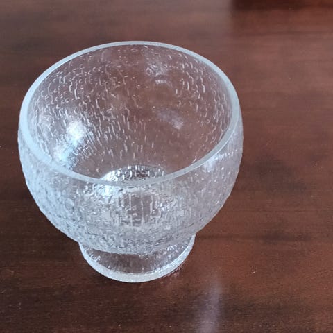Iittalan pieni lasikulho jalallinen kirkas. Kulho on valmistettu lasista ja siinä on kohokuvioitu pinta. Sopii esimerkiksi tarjoiluun tai sisustuskäyttöön. Väri on kirkas ja kulhossa on pyöreä jalkaosa, joka tukee kulhoa pöydällä.