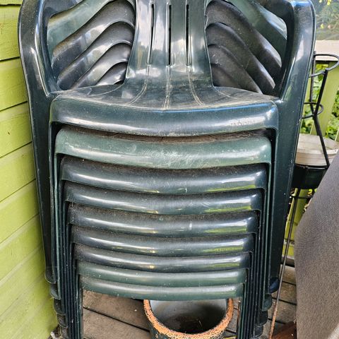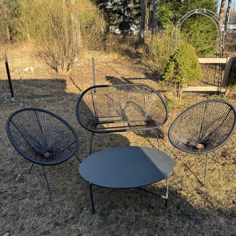 Hyväkuntoiset terassikalusteet, 1kpl pöytä + 4kpl tuoleja + 4kpl tuoleihin kuuluvia pehmusteita. Kalusteet toimivia, käytöstä johtuvaa kulumista pinnoissa voi olla nähtävissä. Pehmusteet hyväkuntoiset ja ehjät. Pöydän jalkaosan voi irroittaa kannesta kuusiopultilla. Kaikki myydään kerralla yhtenä settinä
