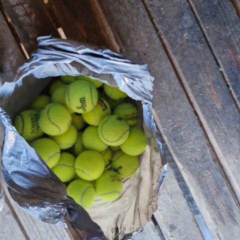 Tennispallo keltaisella pinnalla. Pallon koko vastaa tavallista tennispallon kokoa. Sopii esimerkiksi tenniksen pelaamiseen tai leikkeihin. Materiaalina huopapäällysteinen kumipallo.