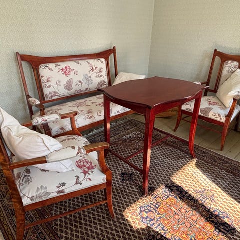 Ihana vihreä maalaisromanttinen astiakaappi. Tapettia kaapin takaosassa, myös alakaapissa ja laatikoissa.