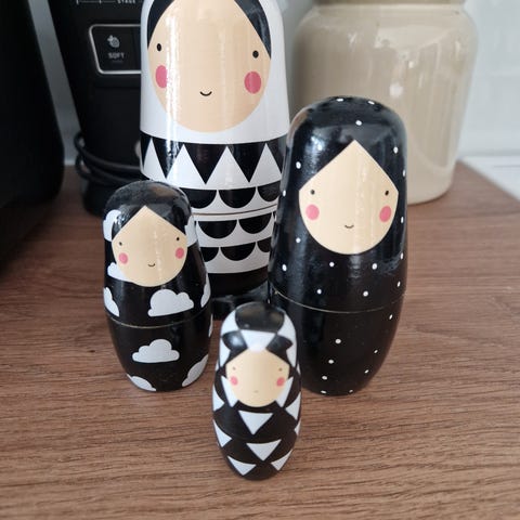 Puiset maatuskanuket, käsinmaalatut moniväriset nuket. Settiin kuuluu useita erikokoisia sisäkkäin meneviä nukkeja, joissa on erilaisia värityksiä ja kuvioita, muun muassa sinisävyinen ja perinteisiä punaisia ja vihreitä sävyjä. Keraaminen nukke keinuu ja soi. Sopii koriste-esineeksi kotiin tai keräilyesineeksi. Materiaali puu, pinta maalattu ja lakattu. Korkeus 18 - 2 cm. Kokonaishinta hinta.
