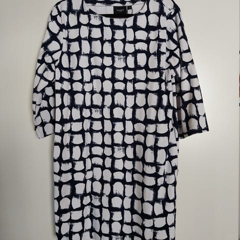 Marimekko Noppeesti Vuoksi mekko, koko 38. Naisten mekko, jossa on kirjava kuosi sinisen ja vaalean sävyissä. Materiaali on 97 % puuvillaa ja 3 % elastaania. Mekossa on puolipitkät hihat, selässä piilovetoketju ja sivulla taskut. Olka-helma mitta 91cm, leveys 50cm. Sopii arkeen tai juhlaan. Pesuohjeen mukaan pestään 40 asteessa, nurinpäin käännettynä ja erillään muista tekstiileistä.