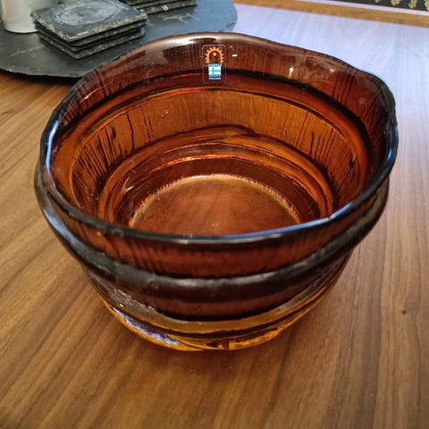 Humppilan Lasi. Koiranputki kulho. kork. 8 cm halk. 12,5 cm. Koristelu Pentti Kallioinen 1986 Nouto.