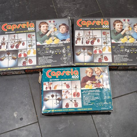 80-luvulla suositun teknisiä ja insinööritaitoja opettavan Capsela-rakennussarjan hyväkuntoisia osia.