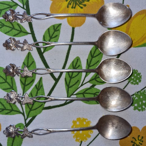 Alpakka ruusukahvilusikat, 9 kpl. 12€ toridiilillä postit ostajalle tai nouto Tuusula Riihikallio. Sopii vaikka korujen aihioksi osaavalle.