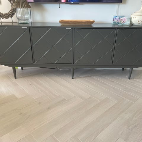 Hyvässä kunnossa oleva laadukas senkki, jossa korkeakiiltoiset ovet.