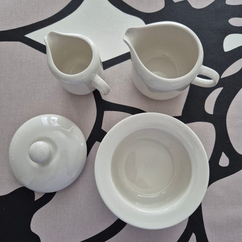 Yhdestä pullalautasesta pieni pala lähtenyt reunan alta. Ei juurikaan näy päältäpäin (löytyy kuvista). Kaupan päälle saa yhden Arabia Arctica sarjan ehjän pullalautasen ja Arabia Arctica Troikka sarjan kermanekan (lohkeama, joka näkyy kuvassa).