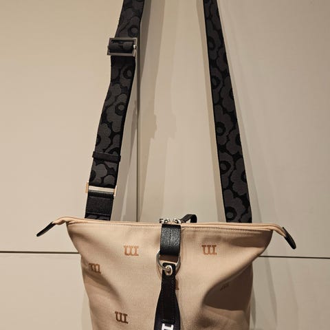Marimekko Carry All unikkokuosinen olkalaukku🖤Laukussa on säädettävä olkahihna ja vetoketjukiinnitys ylhäällä. Ulkopuolella on takapuolella pieni avoin tasku, esim puhelimelle. Sisäpuolella yksi iso tasku ja yksi pieni. Käytetty pari vuotta, muuten erinomaisessa kunnossa, mutta metallisista osista väri jo hieman kulunut joka näkyy viimeisissä kuvissa. Nouto Vantaan Tikkurila, hinta 60€.
