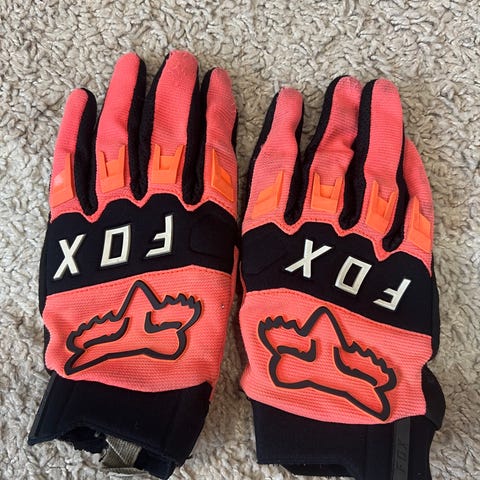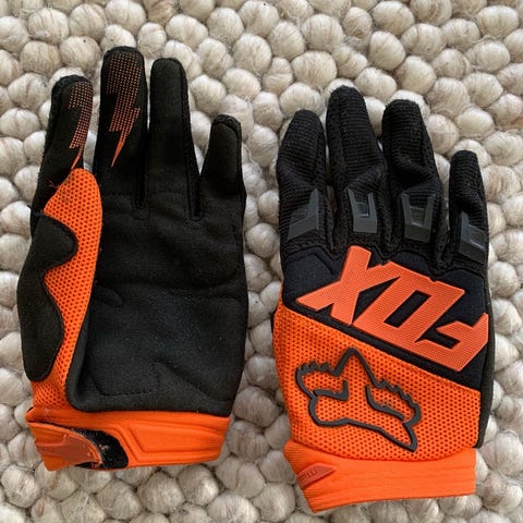 Thor motocross-ajohanskat, koko xs. Pituus keskisormesta ranteeseen 20cm. Kämmenen leveys 9cm.