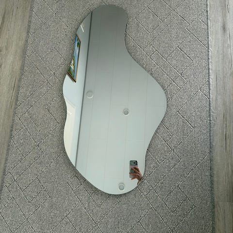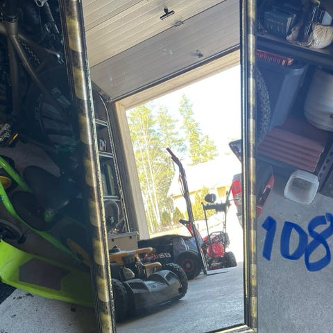 Ohut peili, jossa pyöristetty yläosa ja neliskulmainen alaosa. Takana kiinnityskohdat, mutta muita kiinnitystarvikkeita ei mukana. Pieni naarmu löytyy oikealta ylhäältä (viimeinen kuva).