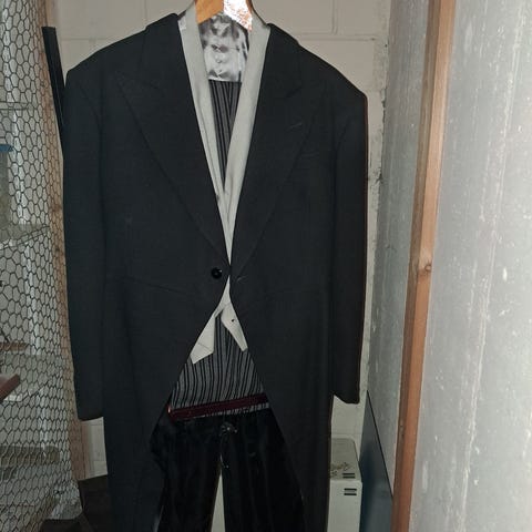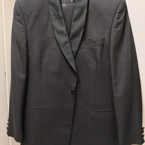 hyväkuntoinen, teetetty smokkipuku, housujen vyötärö 36, pituus 107 cm. Takin rinnanympärys 110 cm ja hihanpituus 65 cm. Mittataulukoiden mukaan L-koko lyhyemmällä lahjepituudella.