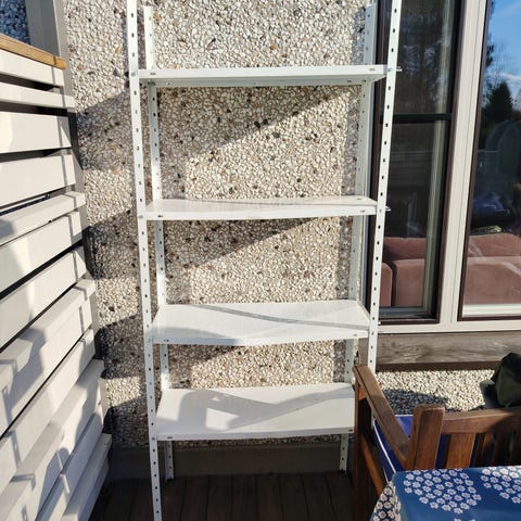 Hyllylevyt heitetty pois kun olivat niin heppoiset. Mutta saa helposti uusittua esm. Vaneriset. Meidän piti uusia mutta hyllyt eivät sovikaan mitoiltaan kaavailtuun tilaan.