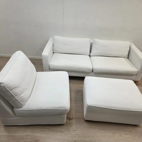 Myydään erittäin hyväkuntoinen Ikea Karlstad 3-istuttava valkoinen sohva. Ollut peitettynä. Toisessa istuintyynyssä himmeä jälki, saattaa lähteä pesussa. Rahi kaupan päälle. Rahiin tehty itse valkoinen päällinen. Myös toiset päälliset on, ne on tumman harmaat, ovat paikoin vähän haalistuneet.