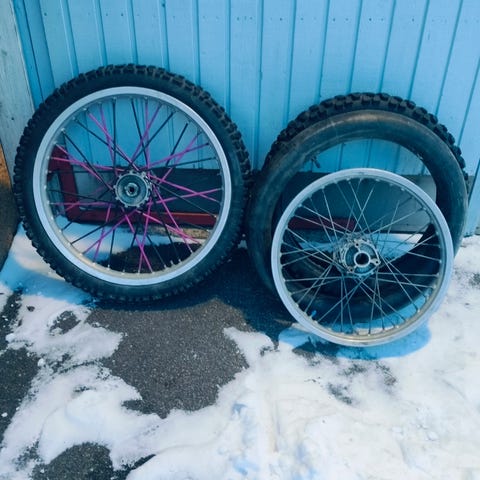 Moottoripyörän vanteet ja renkaat. Kuvassa kaksi vannetta, joista toisessa on jarrulevy valmiiksi asennettuna. Vanteet ovat monipuolilla pinnoilla ja niissä on asennetut renkaat. Sopivat käytettäväksi moottoripyörän pyöräsarjana, kunhan mitat, akselit ja kiinnitykset tarkistetaan omaan ajoneuvoon sopiviksi.