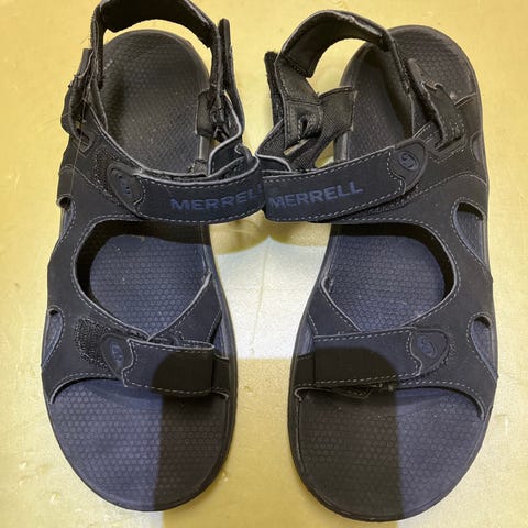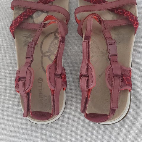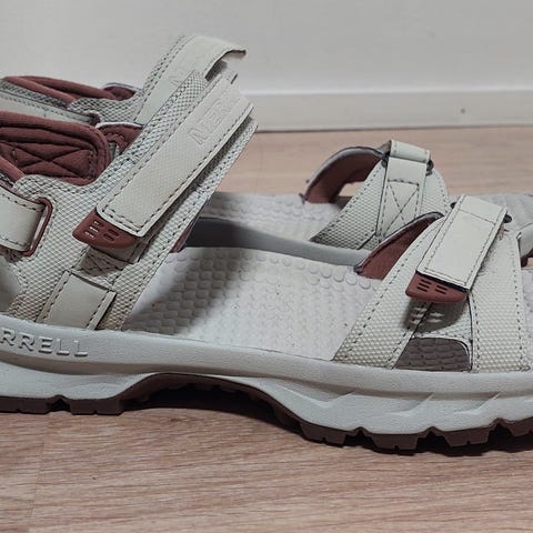 Merrell sandaalit, koko 40. Väri vaalean ruskea oransseilla yksityiskohdilla. Avoin malli, jossa useita remmejä ja tarrakiinnitys nilkan ympärillä. Remmit aitoa nahkaa. Sopivat arkikäyttöön ja ulkoiluun lämpimällä säällä. Käytetty kahdesti ja huomattu olevan liian iso omaan jalkaan.