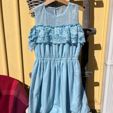 Myydään kaunis tummansininen kauniisti laskeutuva juhlamekko, 140cm. Puhdas ja ehjä. Pari kertaa pidetty. 10€