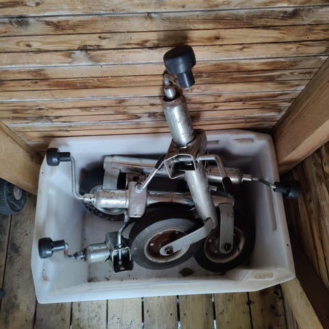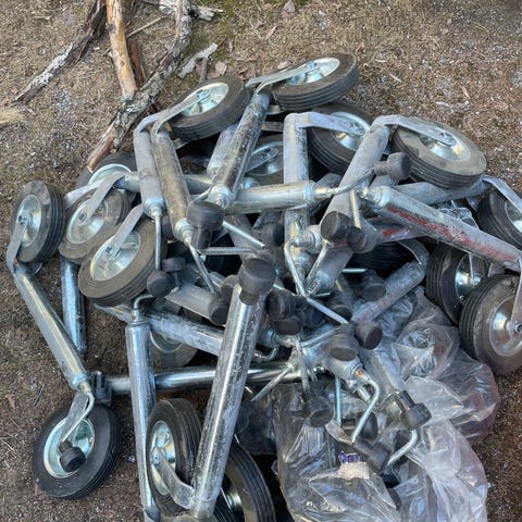 Kerran trailerin siirrossa kätetty peräkärrin-/trailerin nokkapyörä kiinnikkeellä.